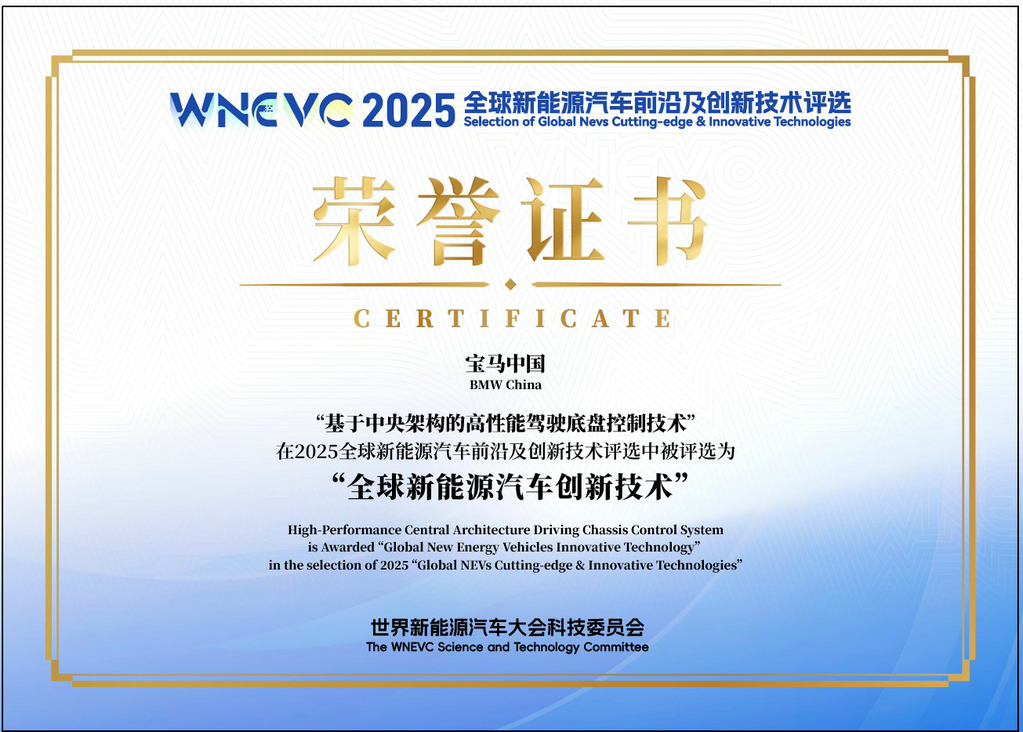 (海口/北京)9月28日,在2025世界新能源汽车大会(WNEVC)上,宝马自主研发的“基于中央架构的高性能驾驶底盘控制技术”,即新世代“驾控超级大脑”,再度荣获“全球新能源汽车创新技术”证书。这也是宝马集团第五次在该大会上获评,同时也是唯一连续四年获得该证书的外资车企。