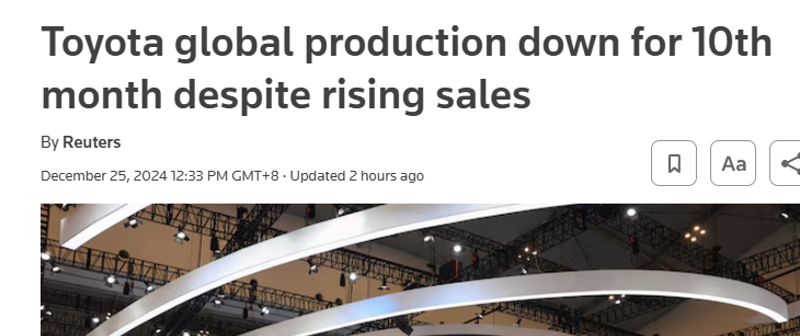 尽管产量持续下滑,但丰田的全球销量却呈现出积极态势。11月份,丰田全球销量连续第二个月上涨,达到了920,569辆,同比上涨1.7%,并创下了11月份的新高。这一增长主要得益于美国和中国市场的强劲需求。