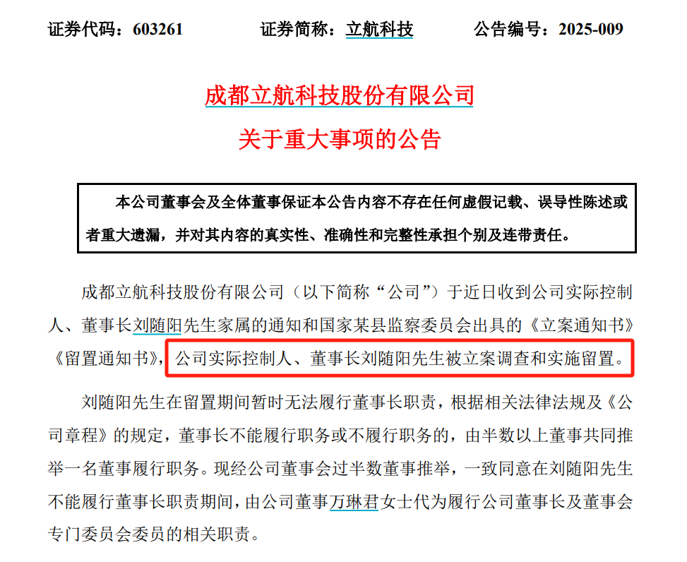 立航科技实控人、董事长被立案调查和实施留置2023配资炒股。 立航科技(603261)3月21日晚间公告,公司近日收到公司实控人、董事长刘随阳家属的通知和国家某县监察委员会出具的《立案通知书》《留置通知书》,刘随阳被立案调查和实施留置。